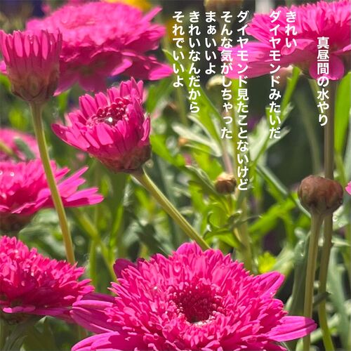 「真昼間の水やり」 きれいダイヤモンドみたいだ ダイヤモンド見たことないけどそんな気がしちゃったまぁいいよきれいなんだからそれでいいよ